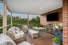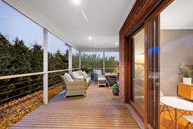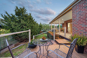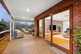 Heavy timber-framed sliding doors open to an elevated undercover deck that wraps around the back of the home, allowing for the creation of several zoned outdoor spaces. A plaster ceiling and downlights finish the space off beautifully. The backyard below has a high conifer border hedge and established landscaping.