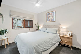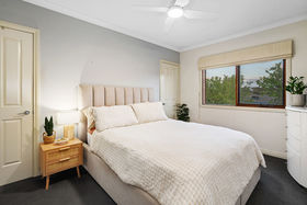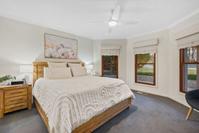 Open the door to a wide entrance hall and maple-toned timber floorboards. The front loungeroom and main bedroom boast cedar timber-framed sash windows with pelmets and blinds. The bedroom is luxurious in size, and has a walk-in robe and ensuite with wide wall-to-wall dual shower.