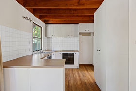 The kitchen adjoins the living and dining area and includes storage cabinetry and preparation space. A separate laundry provides additional household functionality.